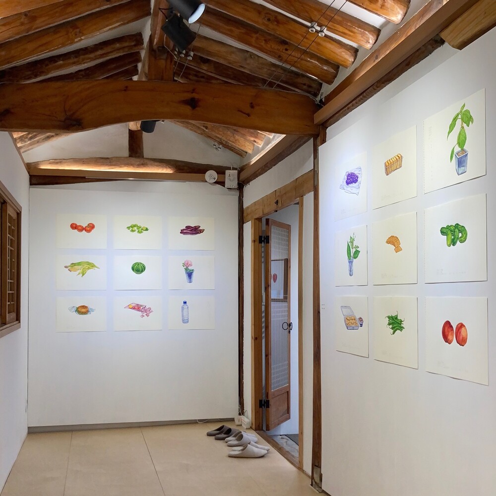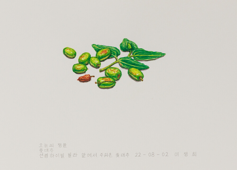 2022년 1월 <오늘의 정물>을 다시 시작했다. 시장에서 시금치, 토마토 같은 먹을거리를 사다가 하나씩 그렸다. 그리고 초안산, 우이천을 걷다가 발견한 풀, 나뭇가지도 가져와 하나씩 그렸다. 어디서나 쉽게 볼 수 있는 평범한 것들이지만 그것들 하나하나가 아름다운 모습을 가진 주인공처럼 보였다. 그래서 특별하지는 않지만 꿋꿋하고 성실하게 살아온 한사람의 초상화를 그리는 마음으로 하나의 정물을 그렸다. 지금까지 정물로 그린 먹을거리들은 대부분 먹어서 없어졌다. 먹지 못하는 것들은 시들어 죽거나, 부서져서 없어졌다. 그러니까 내가 그린 정물들은 이제 이곳에 없다. 그러나 내 몸 속에서 어떤 형태로 변화를 거쳐 나의 일부분이 되었다고 믿는다.