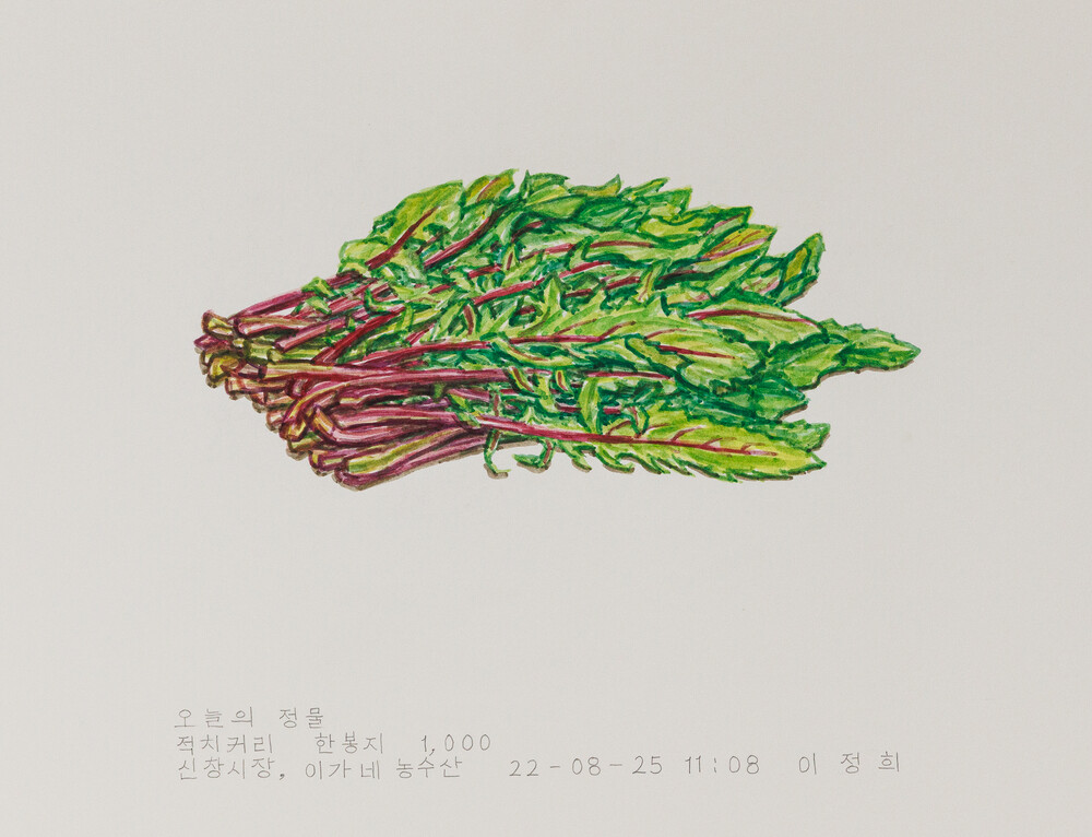 2022년 1월 <오늘의 정물>을 다시 시작했다. 시장에서 시금치, 토마토 같은 먹을거리를 사다가 하나씩 그렸다. 그리고 초안산, 우이천을 걷다가 발견한 풀, 나뭇가지도 가져와 하나씩 그렸다. 어디서나 쉽게 볼 수 있는 평범한 것들이지만 그것들 하나하나가 아름다운 모습을 가진 주인공처럼 보였다. 그래서 특별하지는 않지만 꿋꿋하고 성실하게 살아온 한사람의 초상화를 그리는 마음으로 하나의 정물을 그렸다. 지금까지 정물로 그린 먹을거리들은 대부분 먹어서 없어졌다. 먹지 못하는 것들은 시들어 죽거나, 부서져서 없어졌다. 그러니까 내가 그린 정물들은 이제 이곳에 없다. 그러나 내 몸 속에서 어떤 형태로 변화를 거쳐 나의 일부분이 되었다고 믿는다.