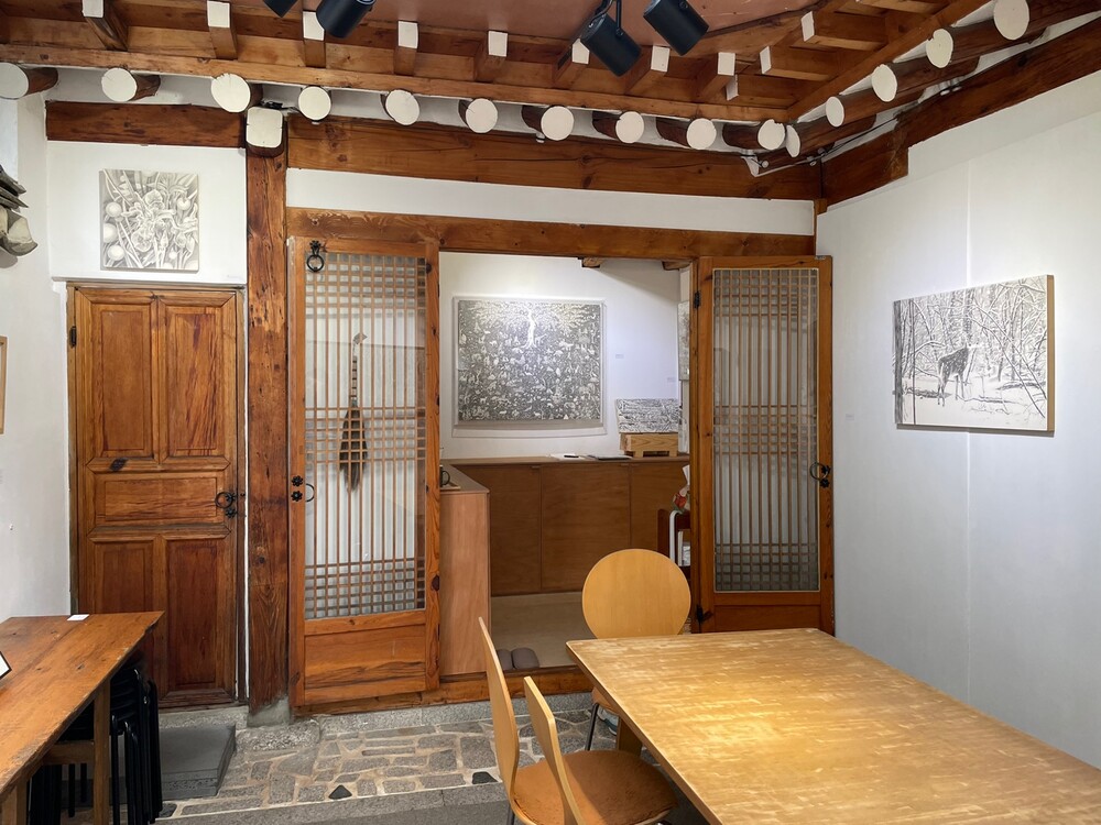 펜촉과 샤프펜슬로 무수한 얇은 선을 쌓아 올려 그리는 작업 방식으로 자연의 시간성과 역사성을 담으려 했다.