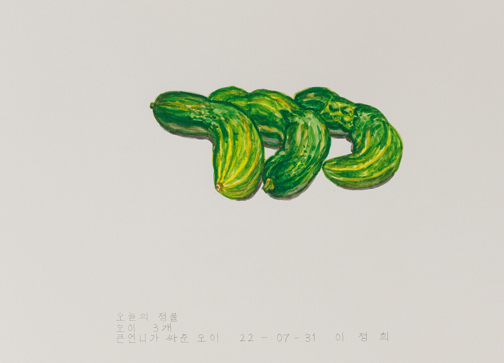 2022년 1월 <오늘의 정물>을 다시 시작했다. 시장에서 시금치, 토마토 같은 먹을거리를 사다가 하나씩 그렸다. 그리고 초안산, 우이천을 걷다가 발견한 풀, 나뭇가지도 가져와 하나씩 그렸다. 어디서나 쉽게 볼 수 있는 평범한 것들이지만 그것들 하나하나가 아름다운 모습을 가진 주인공처럼 보였다. 그래서 특별하지는 않지만 꿋꿋하고 성실하게 살아온 한사람의 초상화를 그리는 마음으로 하나의 정물을 그렸다. 지금까지 정물로 그린 먹을거리들은 대부분 먹어서 없어졌다. 먹지 못하는 것들은 시들어 죽거나, 부서져서 없어졌다. 그러니까 내가 그린 정물들은 이제 이곳에 없다. 그러나 내 몸 속에서 어떤 형태로 변화를 거쳐 나의 일부분이 되었다고 믿는다.