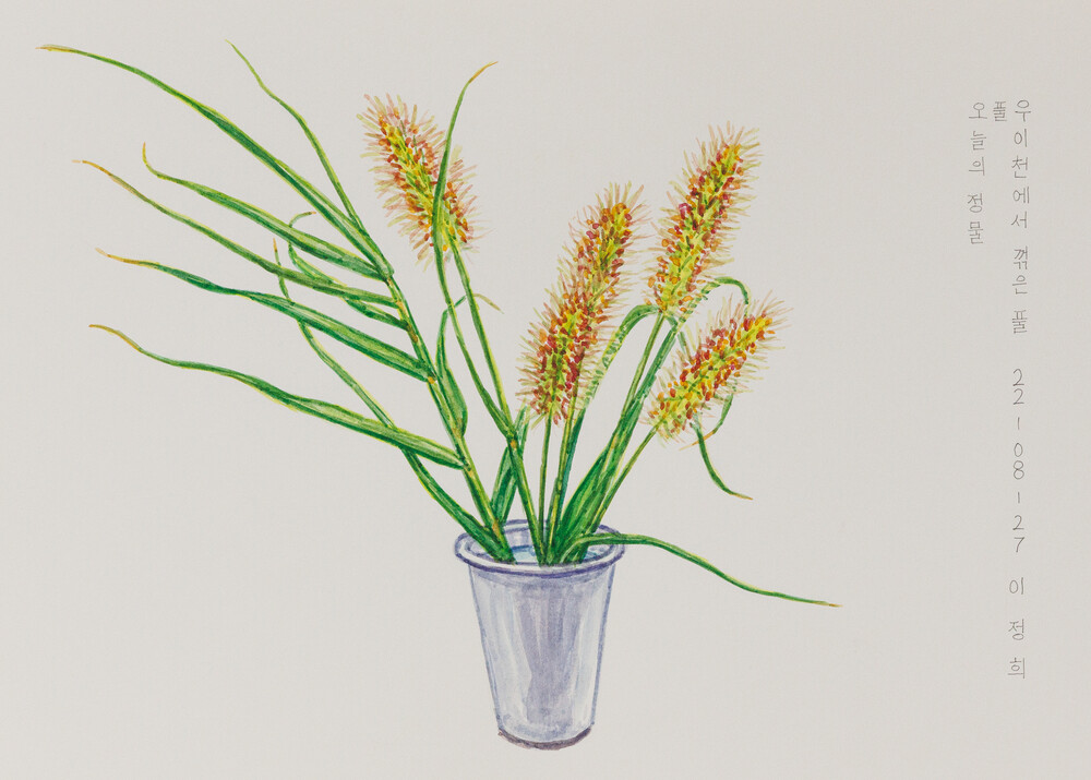 2022년 1월 <오늘의 정물>을 다시 시작했다. 시장에서 시금치, 토마토 같은 먹을거리를 사다가 하나씩 그렸다. 그리고 초안산, 우이천을 걷다가 발견한 풀, 나뭇가지도 가져와 하나씩 그렸다. 어디서나 쉽게 볼 수 있는 평범한 것들이지만 그것들 하나하나가 아름다운 모습을 가진 주인공처럼 보였다. 그래서 특별하지는 않지만 꿋꿋하고 성실하게 살아온 한사람의 초상화를 그리는 마음으로 하나의 정물을 그렸다. 지금까지 정물로 그린 먹을거리들은 대부분 먹어서 없어졌다. 먹지 못하는 것들은 시들어 죽거나, 부서져서 없어졌다. 그러니까 내가 그린 정물들은 이제 이곳에 없다. 그러나 내 몸 속에서 어떤 형태로 변화를 거쳐 나의 일부분이 되었다고 믿는다.