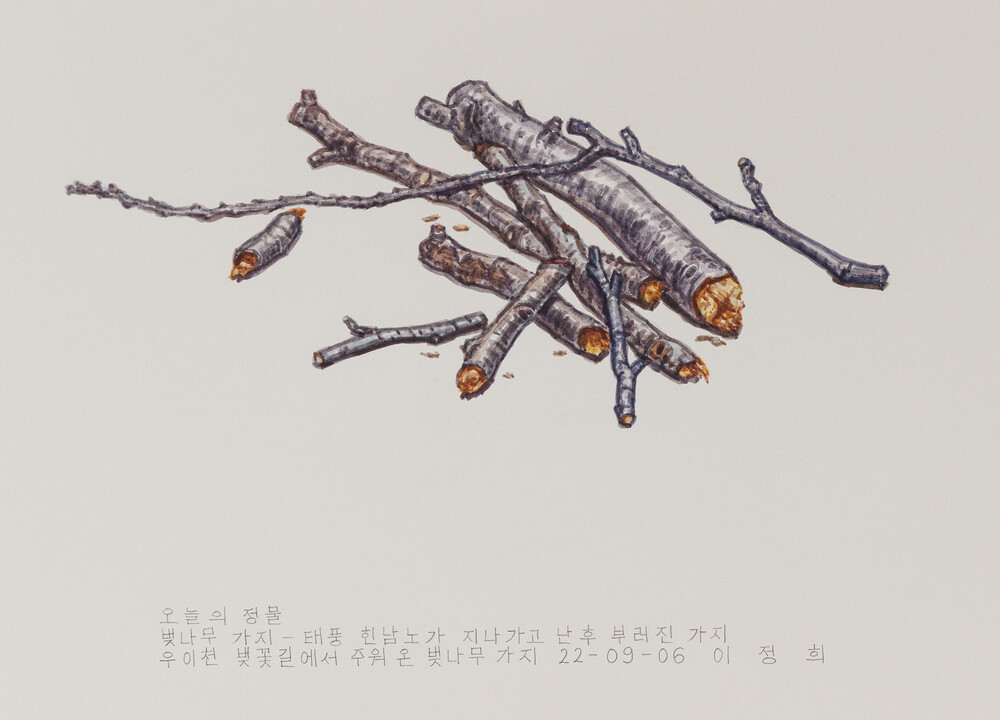 2022년 1월 <오늘의 정물>을 다시 시작했다. 시장에서 시금치, 토마토 같은 먹을거리를 사다가 하나씩 그렸다. 그리고 초안산, 우이천을 걷다가 발견한 풀, 나뭇가지도 가져와 하나씩 그렸다. 어디서나 쉽게 볼 수 있는 평범한 것들이지만 그것들 하나하나가 아름다운 모습을 가진 주인공처럼 보였다. 그래서 특별하지는 않지만 꿋꿋하고 성실하게 살아온 한사람의 초상화를 그리는 마음으로 하나의 정물을 그렸다. 지금까지 정물로 그린 먹을거리들은 대부분 먹어서 없어졌다. 먹지 못하는 것들은 시들어 죽거나, 부서져서 없어졌다. 그러니까 내가 그린 정물들은 이제 이곳에 없다. 그러나 내 몸 속에서 어떤 형태로 변화를 거쳐 나의 일부분이 되었다고 믿는다.