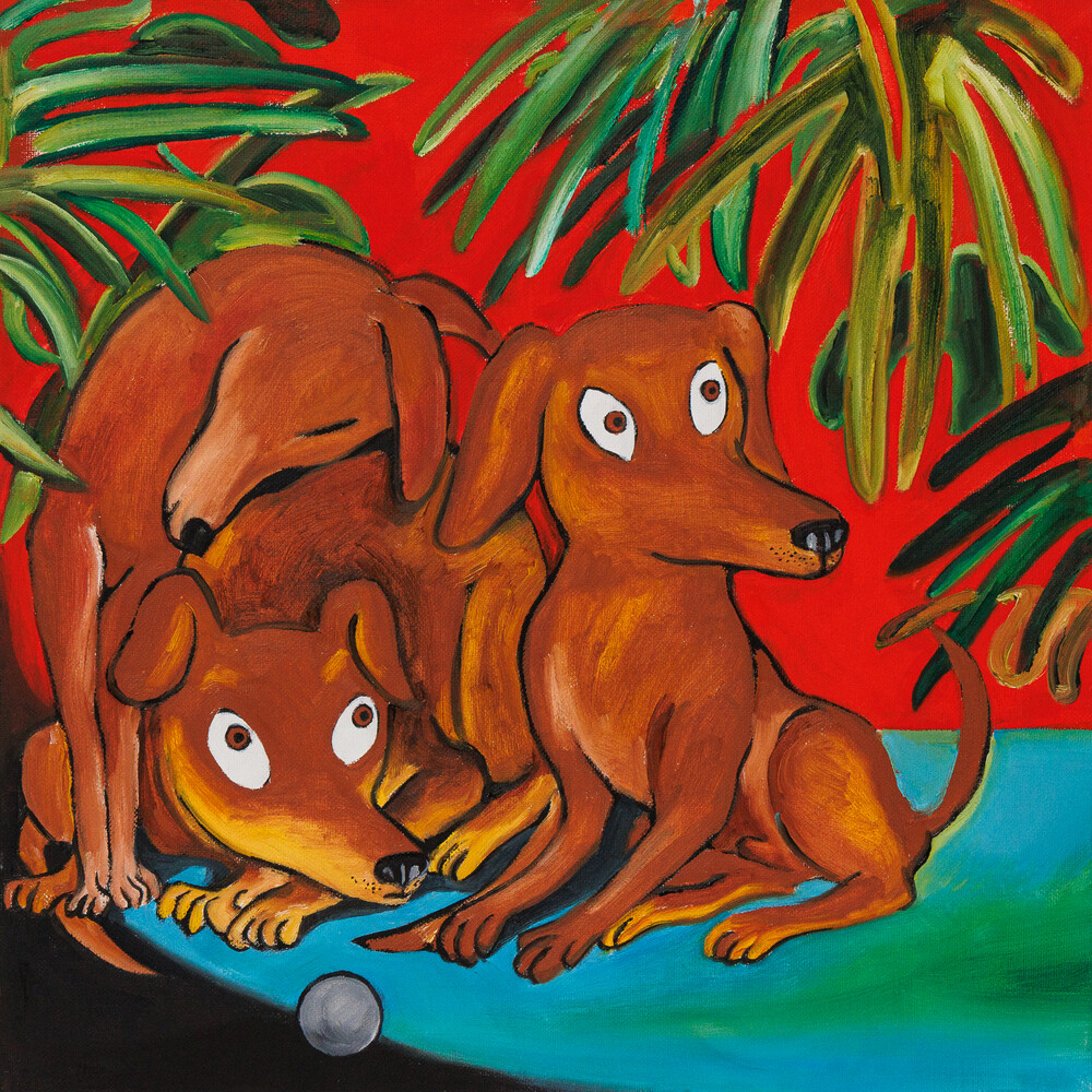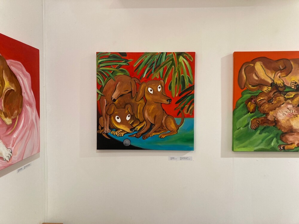 개와 살아온 시간만큼 개의 습성과 몸의 구조를 알아서 그들의 자세도 감정도 자연스럽게 상상할 수 있었다. 외롭고 신나고 서로에게 의지하고 차분히 응시하기도 하는 개들을 그렸다. 두려워하지만 호기심에 찬 개들. 결국 상상은 사람인 내 몫이었다. 그래서 그림 속 개의 눈은 인간을 닮았다. 불확실한 확신 속에서 그들의 마음을 상상하는 일이 즐거웠다. 개와 인간 사이 넓고 깊은 낭떠러지에 개들의 슬픔, 개들의 안도, 그들의 평화, 인간과 사는 개들의 피로함, 개와 사는 사람의 피로함이 쌓이고 채워져 우리는 배를 타고 만난다. 내개를 완벽히 이해한다는 것은 허공에 찬물을 건너는 일처럼 마법같은 일이라는 걸 안다.다만 우리는 조금씩 외로워서, 사람도 개도 어느 순간에는 약해진다는 것을 알아서 허공에 배를 타고 만나서 우정을 쌓는다. 까만 개는 어렸을 때보다 약해지고 화가 많아지고 참을성이 없어졌다. 나에게 날카로웠던 태도에는 오히려 약간의 너그러움이 더해졌다. 나도 그랬다. 부드러움이 우리가 같이 나이먹는다는 증거가 되었다. 나는 늙어가는 개와 쌓아온 우정과 희석된미움을 양분 삼아 그림 속 개들을 그렸다.