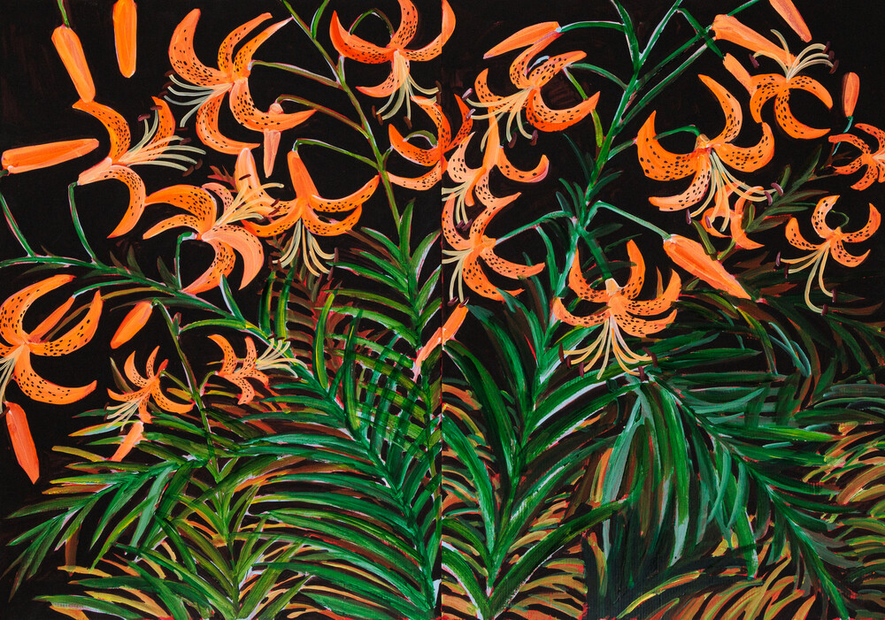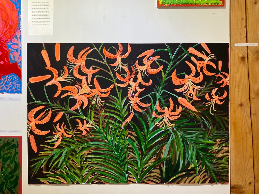 나리꽃은 여름이 한창일 때 피었다. 나비같기도 하고 외계생물처럼 보이는 기묘한 생김새가 끌렸다. 흔히 꽃집에서 팔고 있는 나리꽃으로는 줄기와 잎이 달린 원래의 모양을 알 수가 없다. 야생에서 만나는 나리꽃의 주인공은 사실 꽃이 아니라 어른 키보다 높은 줄기와 짙은 초록빛의 억센 잎이다. 그 위에 나비처럼 사뿐 한 몇조각의 꽃들은 귀여운편이다. 여름을 그리고 싶다고 마음 먹었을 때 제일 먼저 그리고 싶던 것이 나리꽃이었다. 길가에서 만난 크고 높은 꽃과 줄기가 여름의 습기를 모두 흡수한 듯 덩치가 무성하게 피어있었다. 실외기는 열기를 뿜어내고 사람들은 더위에 지쳐 지나가는 대로변에서 무심히 생명을 뿜어내고 있었다.