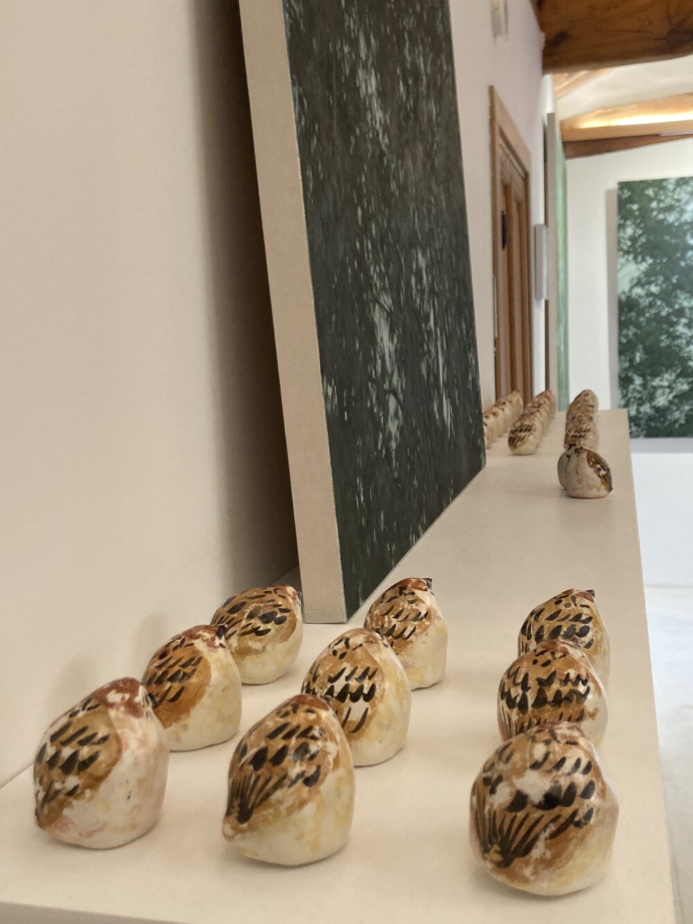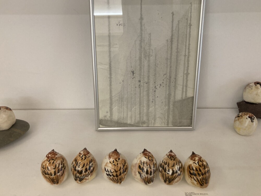 도자기는 아니고, 지점토로 만들었다. 백 개 정도 만든 것 같은데, 한 데 모아 놓고 보면 운집해 있는 모습이 하나의 작품이 될 것 같더라. 이 새 한 마리가 회화 속 점 하나의 느낌이랄까. 2012년 아는 형이랑 같이 살던 이태원 집에 큰 창이 있었는데, 창을 열면 감나무가 보이던 바깥 풍경이 그 집의 낭만이었다. 그 풍경을 보고 싶어, 우풍도 세고 안그래도 추운집에서 한참을 창을 열고 밖을 바라보곤 했었다. 푸르렀던 계절이 지나면 나무에서 감이 무르익고, 그것도 다 사라진 한 겨울에는 잎도 다 떨어져 메마른 가지만 남은 모습도 바라다보고, 아침 새소리도 듣고, 새들이 쉬었다가 물 마시는 것도 보고, 앙상한 가지에 앉은 모습도 지켜보고. 관심이 가기 시작해 그때부터는 발견할 때마다 관찰하고 사진으로도 기록하고, 조금씩 작품 속에 작은새를 그려넣기 시작했고, 그 새가 여기까지 오게 되었다.
