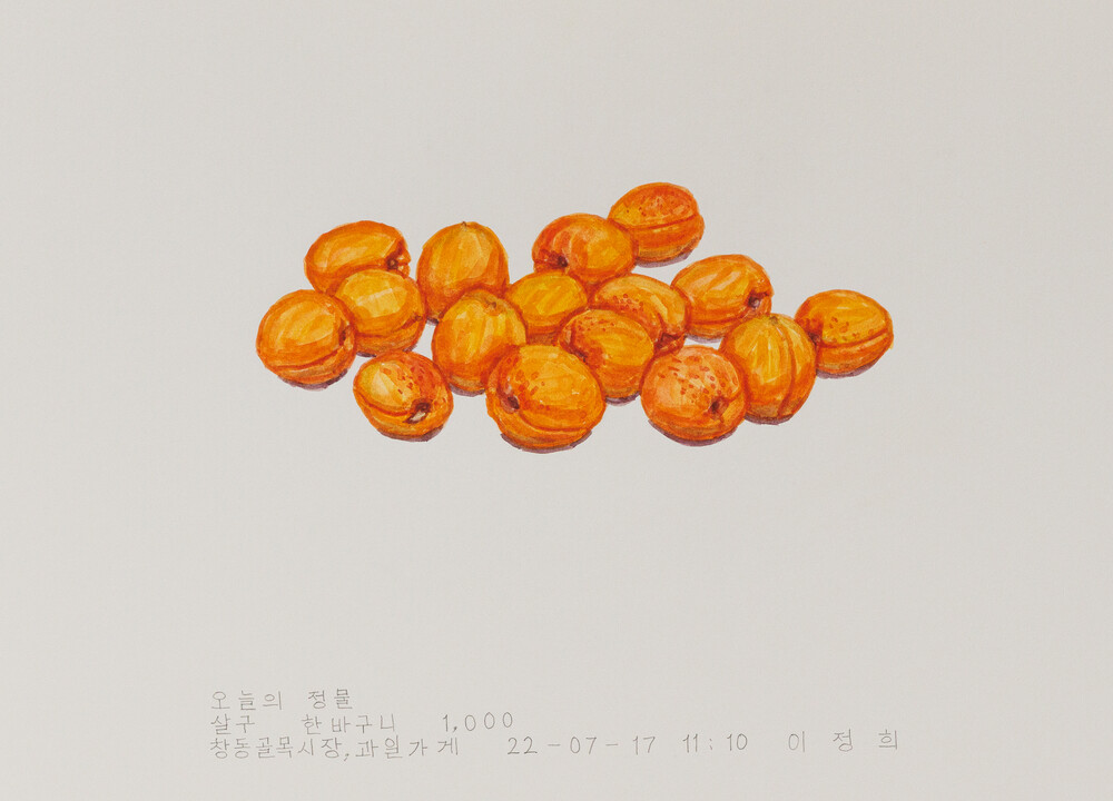 2022년 1월 <오늘의 정물>을 다시 시작했다. 시장에서 시금치, 토마토 같은 먹을거리를 사다가 하나씩 그렸다. 그리고 초안산, 우이천을 걷다가 발견한 풀, 나뭇가지도 가져와 하나씩 그렸다. 어디서나 쉽게 볼 수 있는 평범한 것들이지만 그것들 하나하나가 아름다운 모습을 가진 주인공처럼 보였다. 그래서 특별하지는 않지만 꿋꿋하고 성실하게 살아온 한사람의 초상화를 그리는 마음으로 하나의 정물을 그렸다. 지금까지 정물로 그린 먹을거리들은 대부분 먹어서 없어졌다. 먹지 못하는 것들은 시들어 죽거나, 부서져서 없어졌다. 그러니까 내가 그린 정물들은 이제 이곳에 없다. 그러나 내 몸 속에서 어떤 형태로 변화를 거쳐 나의 일부분이 되었다고 믿는다.
