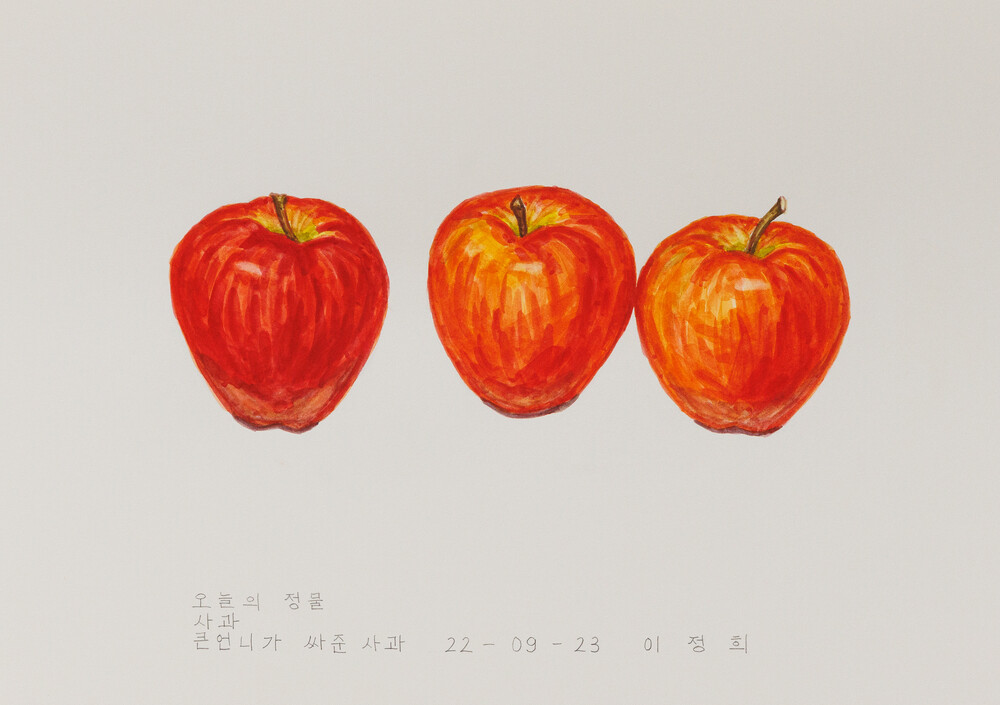 2022년 1월 <오늘의 정물>을 다시 시작했다. 시장에서 시금치, 토마토 같은 먹을거리를 사다가 하나씩 그렸다. 그리고 초안산, 우이천을 걷다가 발견한 풀, 나뭇가지도 가져와 하나씩 그렸다. 어디서나 쉽게 볼 수 있는 평범한 것들이지만 그것들 하나하나가 아름다운 모습을 가진 주인공처럼 보였다. 그래서 특별하지는 않지만 꿋꿋하고 성실하게 살아온 한사람의 초상화를 그리는 마음으로 하나의 정물을 그렸다. 지금까지 정물로 그린 먹을거리들은 대부분 먹어서 없어졌다. 먹지 못하는 것들은 시들어 죽거나, 부서져서 없어졌다. 그러니까 내가 그린 정물들은 이제 이곳에 없다. 그러나 내 몸 속에서 어떤 형태로 변화를 거쳐 나의 일부분이 되었다고 믿는다.