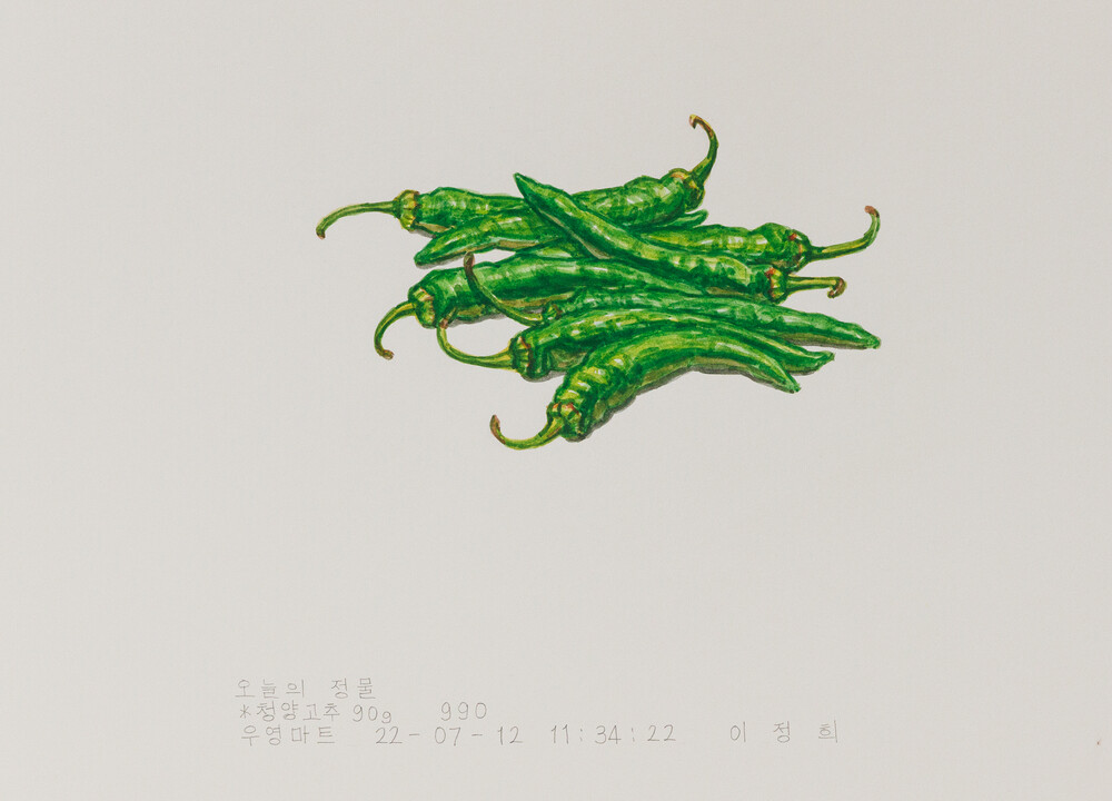 2022년 1월 <오늘의 정물>을 다시 시작했다. 시장에서 시금치, 토마토 같은 먹을거리를 사다가 하나씩 그렸다. 그리고 초안산, 우이천을 걷다가 발견한 풀, 나뭇가지도 가져와 하나씩 그렸다. 어디서나 쉽게 볼 수 있는 평범한 것들이지만 그것들 하나하나가 아름다운 모습을 가진 주인공처럼 보였다. 그래서 특별하지는 않지만 꿋꿋하고 성실하게 살아온 한사람의 초상화를 그리는 마음으로 하나의 정물을 그렸다. 지금까지 정물로 그린 먹을거리들은 대부분 먹어서 없어졌다. 먹지 못하는 것들은 시들어 죽거나, 부서져서 없어졌다. 그러니까 내가 그린 정물들은 이제 이곳에 없다. 그러나 내 몸 속에서 어떤 형태로 변화를 거쳐 나의 일부분이 되었다고 믿는다.
