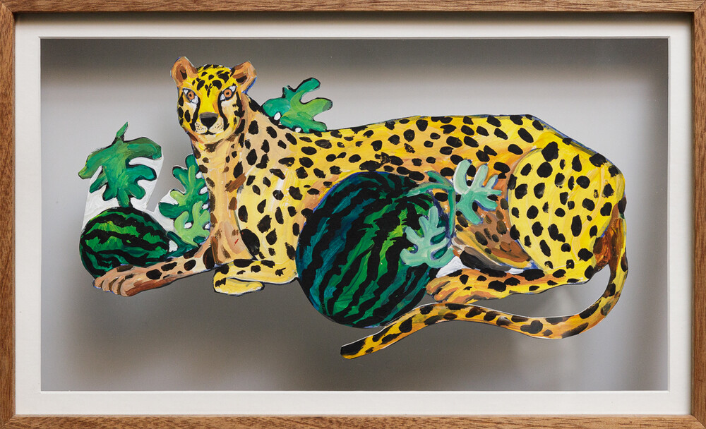 종이 꼴라쥬에 아크릴로 채색한 것인데, 수박과 치타 서로가 서로의 패턴에 의지해 숨어 있는 모습이