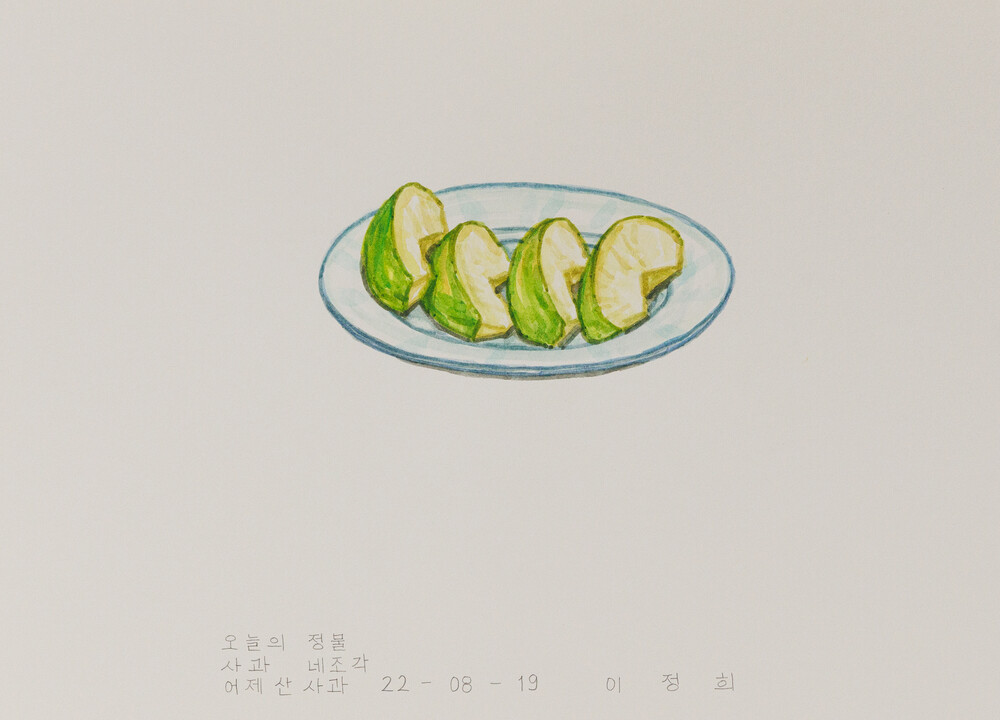2018년에 <오늘의 정물>을 처음 시작했다. 전시장을 작업실로 사용하는 프로젝트 전시를 위해 한달 동안 전시장에 출근해서 작업을 했는데 허기를 채우기 위해 매일 간식거리를 사 먹었다. 먹으려고 사온 간식거 리를 힘 빼고 연필로 한장씩 그렸다. 내가 먹을 음식물을 그림의 모델로 보고 있으니까 그 행위가 마치 나 자신을 저쪽 자리에 두고 관찰하는 일 같았다.