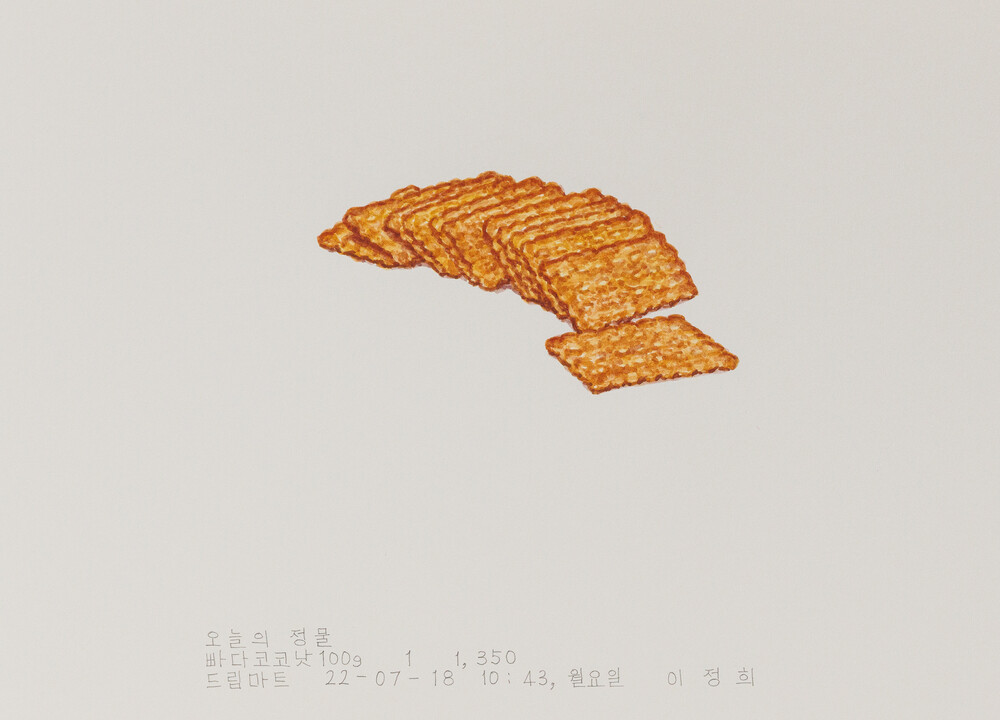 2018년에 <오늘의 정물>을 처음 시작했다. 전시장을 작업실로 사용하는 프로젝트 전시를 위해 한달 동안 전시장에 출근해서 작업을 했는데 허기를 채우기 위해 매일 간식거리를 사 먹었다. 먹으려고 사온 간식거 리를 힘 빼고 연필로 한장씩 그렸다. 내가 먹을 음식물을 그림의 모델로 보고 있으니까 그 행위가 마치 나 자신을 저쪽 자리에 두고 관찰하는 일 같았다.