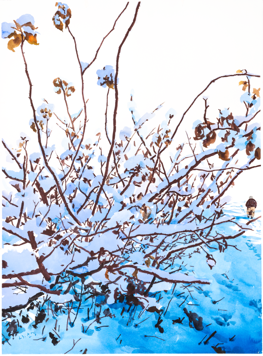 약 삼년간 겨울마다 꺼내그린 파주 문산의 겨울풍경은 단지 어떤 지역의 모습이기 전에 제가 오랜 도시 생활에서 잃어버린 감각을 깨우는 경험을 그린 것입니다. 처음 시골생활을 시작했고, 겨울이면 영하 30도를 넘나드는 긴 추위에 적응하며 저는 비로소 겨울없이는 그 어떤 봄도 오지 않는다는 사실을 체감합니다. 생각보다 눈이 자주 오지는 않았지만, 논밭에 쌓인 설경을 본 후로는 큰 눈이 내리고 난 뒤 양말을 두껍게 신고 아무도 밟지 않은 시골논두렁을 걷는것이 큰 기쁨이 되었어요. 시골이라 해도 인간의 손이 미치지 않은 곳 없지만 그래도 아직은 발견할 수 있는 자연의 신비로움과 환희, 혹독함 안에 잔재한 생명의 안위를 제가 감히 그릴수 있을까요? 고백하자면, 섣부른 위로를 하고자 그린 그림들은 아닙니다. 하지만 같이 걸을수는 있지요. 걸으며 하나씩 내려놓고, 다시 돌아오면 개운해 지시길.