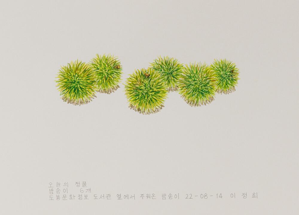 2022년 1월 <오늘의 정물>을 다시 시작했다. 시장에서 시금치, 토마토 같은 먹을거리를 사다가 하나씩 그렸다. 그리고 초안산, 우이천을 걷다가 발견한 풀, 나뭇가지도 가져와 하나씩 그렸다. 어디서나 쉽게 볼 수 있는 평범한 것들이지만 그것들 하나하나가 아름다운 모습을 가진 주인공처럼 보였다. 그래서 특별하지는 않지만 꿋꿋하고 성실하게 살아온 한사람의 초상화를 그리는 마음으로 하나의 정물을 그렸다. 지금까지 정물로 그린 먹을거리들은 대부분 먹어서 없어졌다. 먹지 못하는 것들은 시들어 죽거나, 부서져서 없어졌다. 그러니까 내가 그린 정물들은 이제 이곳에 없다. 그러나 내 몸 속에서 어떤 형태로 변화를 거쳐 나의 일부분이 되었다고 믿는다.