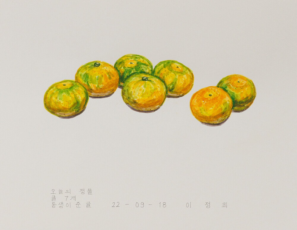 2022년 1월 <오늘의 정물>을 다시 시작했다. 시장에서 시금치, 토마토 같은 먹을거리를 사다가 하나씩 그렸다. 그리고 초안산, 우이천을 걷다가 발견한 풀, 나뭇가지도 가져와 하나씩 그렸다. 어디서나 쉽게 볼 수 있는 평범한 것들이지만 그것들 하나하나가 아름다운 모습을 가진 주인공처럼 보였다. 그래서 특별하지는 않지만 꿋꿋하고 성실하게 살아온 한사람의 초상화를 그리는 마음으로 하나의 정물을 그렸다. 지금까지 정물로 그린 먹을거리들은 대부분 먹어서 없어졌다. 먹지 못하는 것들은 시들어 죽거나, 부서져서 없어졌다. 그러니까 내가 그린 정물들은 이제 이곳에 없다. 그러나 내 몸 속에서 어떤 형태로 변화를 거쳐 나의 일부분이 되었다고 믿는다.