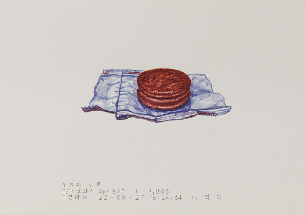 2018년에 <오늘의 정물>을 처음 시작했다. 전시장을 작업실로 사용하는 프로젝트 전시를 위해 한달 동안 전시장에 출근해서 작업을 했는데 허기를 채우기 위해 매일 간식거리를 사 먹었다. 먹으려고 사온 간식거 리를 힘 빼고 연필로 한장씩 그렸다. 내가 먹을 음식물을 그림의 모델로 보고 있으니까 그 행위가 마치 나 자신을 저쪽 자리에 두고 관찰하는 일 같았다.