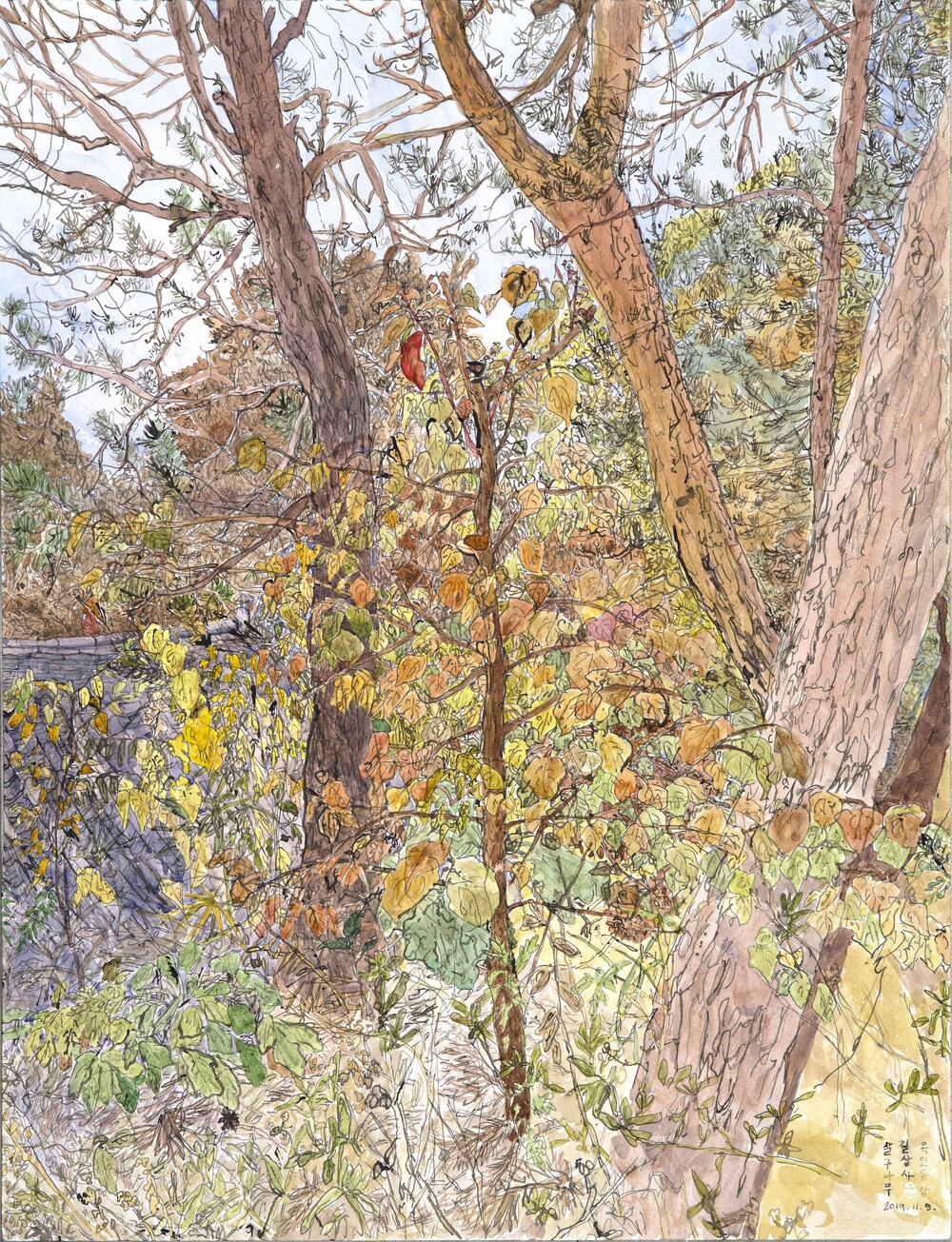 야외에서 사생하기를 즐기는 작가는 자신에게 향수가 되는 장소를 그려 남겨왔다. 다리부상과 펜데믹이 닥치며 더이상 밖에서의 작업이 어렵게 되자 작가는 자유롭게 누리던 시간들을 되살려 먹으로 선을 긋고 조색한 색을 채워 넣어 추상의 패턴으로 자신의 향수를 표현하였다. 어떠한 대상을 보고 자신만의 화풍으로 옮기던 작업이 '패턴'으로 발전하게 된 것이 급진적인 것은 아니다. 작가의 지난 시간들을 아는 것이 흐름을 읽는 것에 도움이 된다. 작가는 의상디자인을 전공하고, 실내 장식 마감재 회사의 추이를 분석하는 담당자로 오랜시간 일했다. 선(line)과 선(line)이 만나 기하학적 무늬를 만들어내고, 조색한 색을 채워 분위기를 만들어내는 패턴 작업은 작가가 오래 동경해온 것이기도 하다. 작가의 야외 사생에서 보이는 좋아하는 숲길 나무 가지의 얼기설기 모양과 동네 골목에 자라난 무성한 식물, 좋아하는 동네의 건물과 바닥에서도 섬세한 패턴의 김새를 알아차릴 수 있다. 패턴 작업은 작가에게 자신을 표현하는 추상의 방법이고, 작가가 늘 이야기하는 향수(nostalgia)인 셈이다.